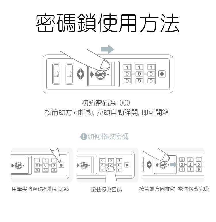 ■ 此款行李箱為TSA國際海關鎖,原廠預設000,請自行設定自己專屬的密碼。